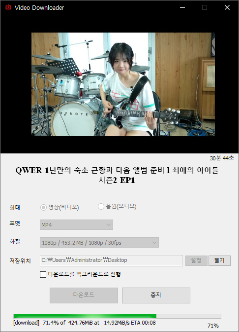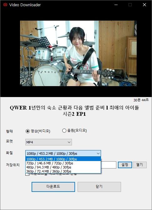 잠시 기다리면 이제 다운로드 설정이 나옵니다. 형태 영상이나 음원 그리고 영상 확장자 포맷 해상도 저장위치를 사용자에 맞게 설정합니다.