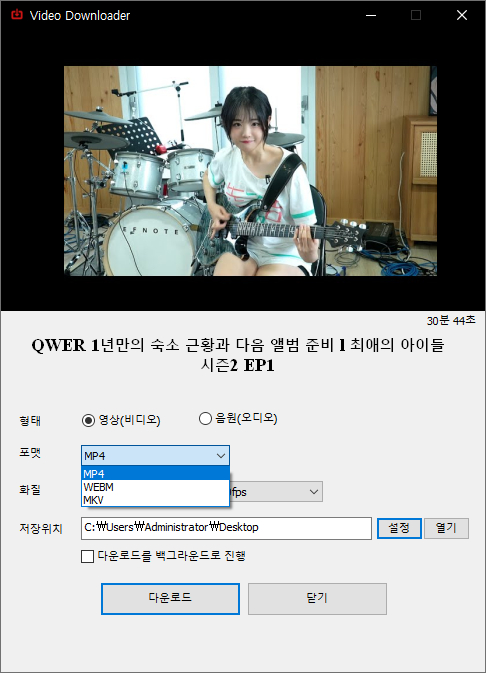 포맷은 다른 프로그램들과 같은 형태의 MP4, WEBM, MKV 지원합니다. 이제 다운로드 버튼을 클릭 합니다.