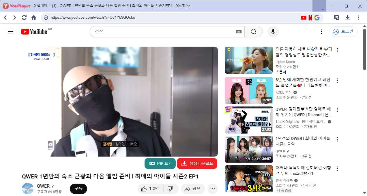 유튜브 접속 후 페이지 에서 원하는 영상을 검색 하면 깔끔하게 재생이 됩니다. 여기서 PIP 보기 와 영상 다운로드 기능을 지원 합니다.