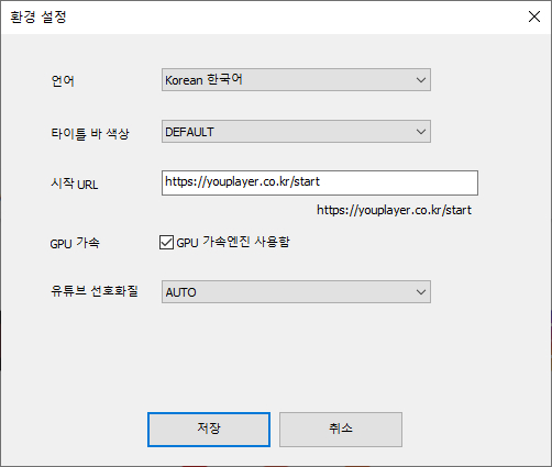 환경설정 옵션을 보면 언어, 타이틀바 색상, 시작페이지, GPU 가속, 화질 설정을 할 수 있습니다.