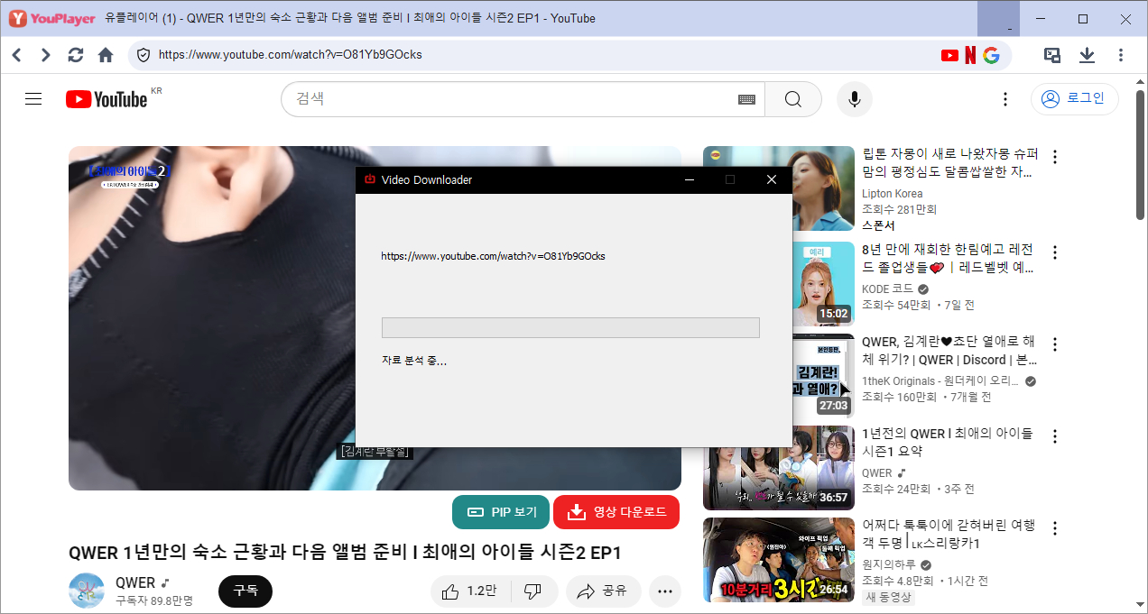 시청중인 페이지에서 하단의 영상 다운로드 버튼 클릭 하면 영상에 대한 자료 분석을 진행 합니다.
