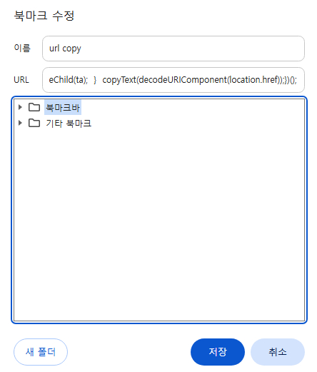 북마크 수정이 나오면 이름은 원하는 이름과 URL 입력창에 아래 하단의 스크립트를 복사 후 붙여넣기 해주시고 저장해주시면 됩니다.