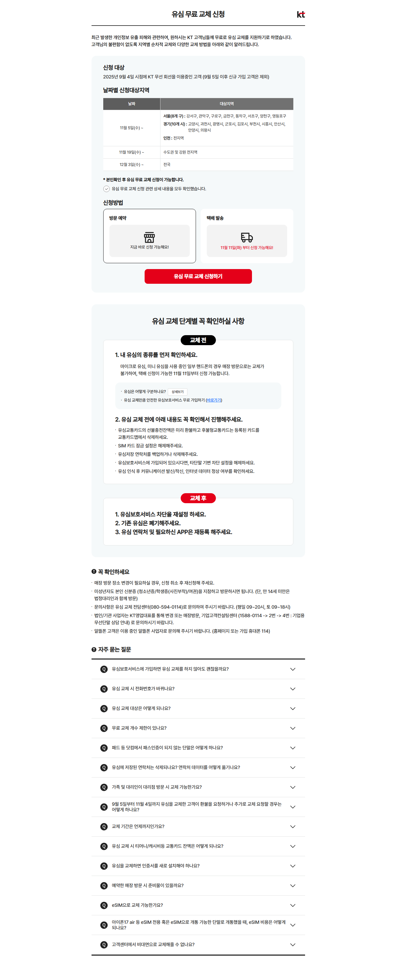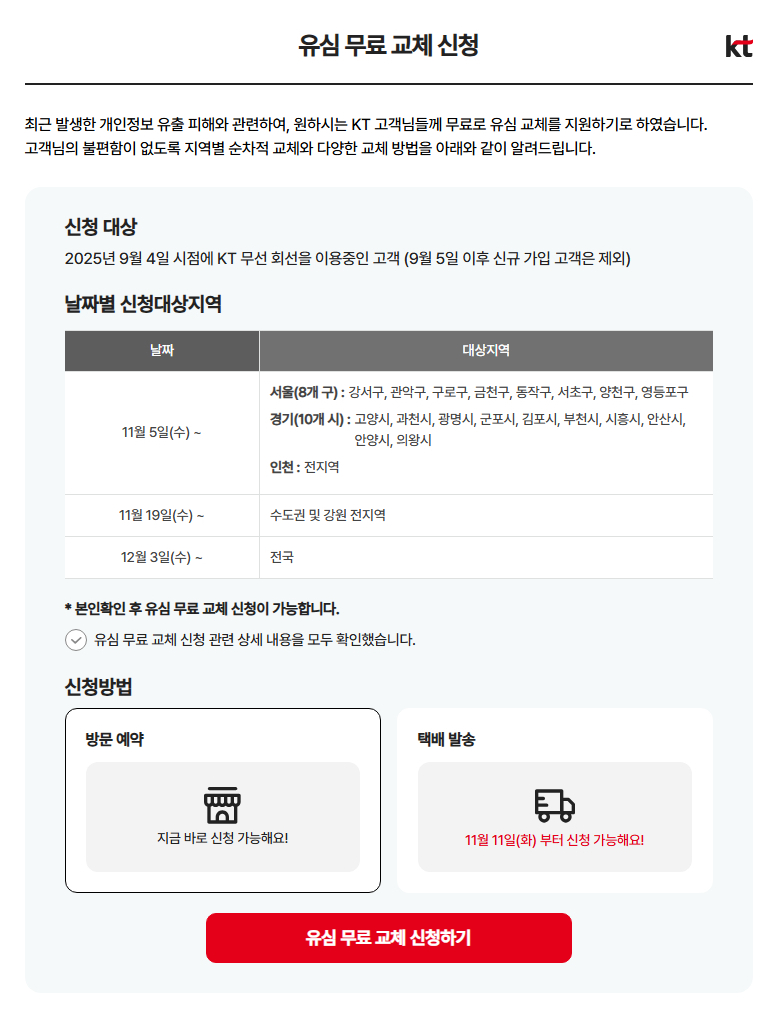 11월 5일부터 해당 지역내 거주하고있는 KT 이용하시는분들은 신청 후 가까운 KT에서 유심을 무료로 교체 받으실 수 있습니다.