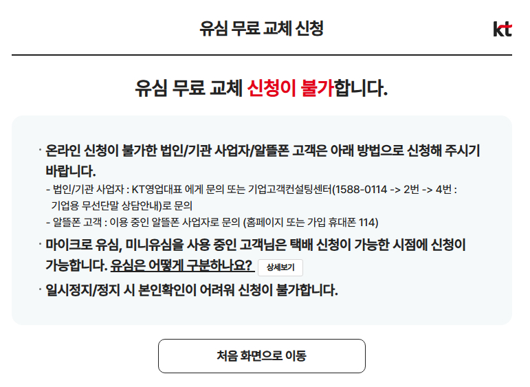 참고로 알뜰폰 이용하시는 KT 이용자는 본인인증 후 교체 신청을 하려고해도 KT 자회사에서는 불가능합니다.