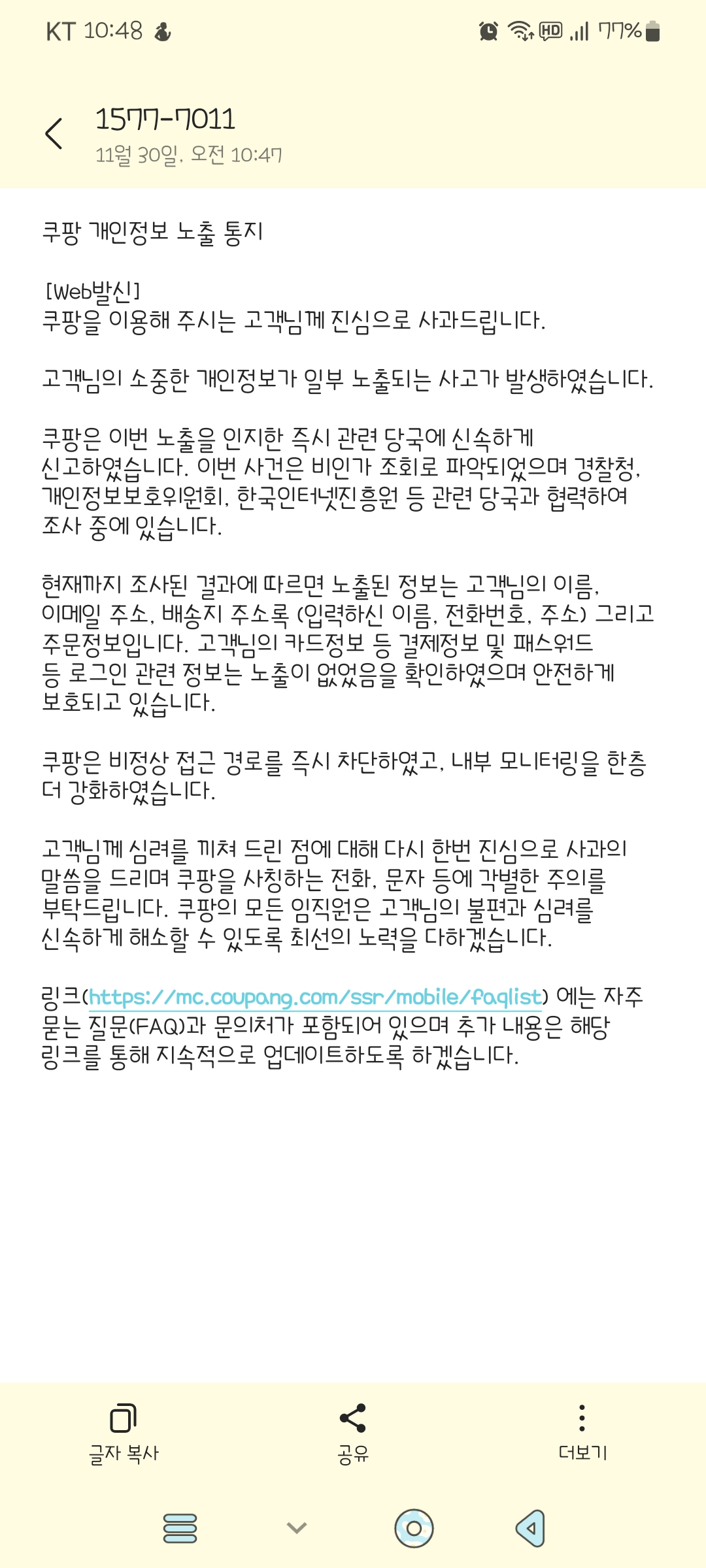 그뒤 얼마 지난뒤에 문자로 유출사실의 알리게됩니다. 지금 본인의 경우 SKT 에서 개인정보가 털렸고 이번에 쿠팡에서도 털리고 문제가 심각합니다.