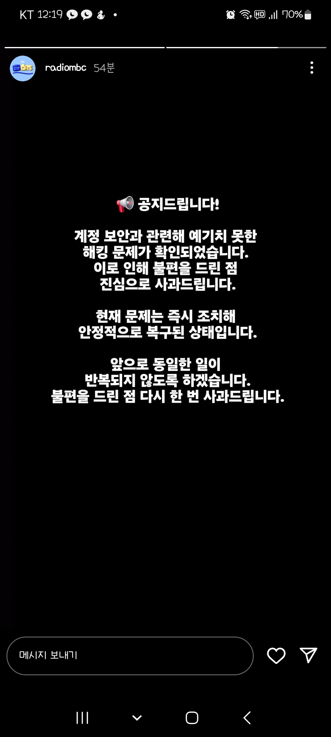 MBC radio 계정의 인스타그램이 해킹 문제가 발생한듯합니다. 설마 아니겠지 했는데 공식계정이 탈취 되었다가 복구된듯합니다.