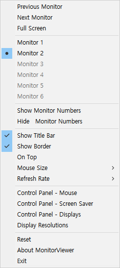 프로그램 실행하면 나타나는 듀얼모니터 화면 뷰 입니다. 다음 메뉴도 지원합니다. 뷰 화면에서 우클릭 하게되면