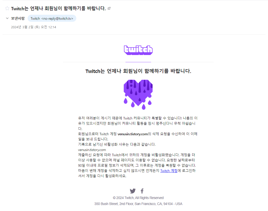 혹시라도 트위치 계정을 다시 복원 하고 싶다고한다면 트위치에 로그인해서 계정을 활성화 하시면 됩니다.