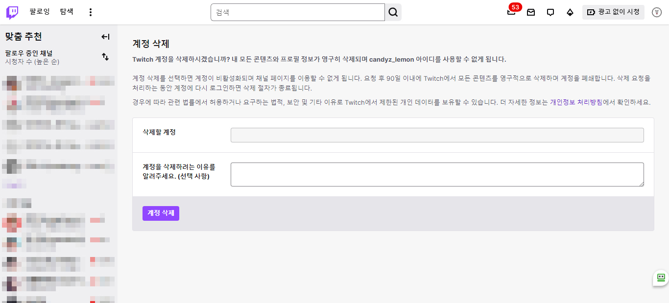 삭제 했습니다. 그런뒤 계정까지도 완전히 탈퇴 처리를 완료 했습니다. 혹시라도 트위치 이용하면서 트위치 탈퇴 하실분은 참고하시기 바랍니다.