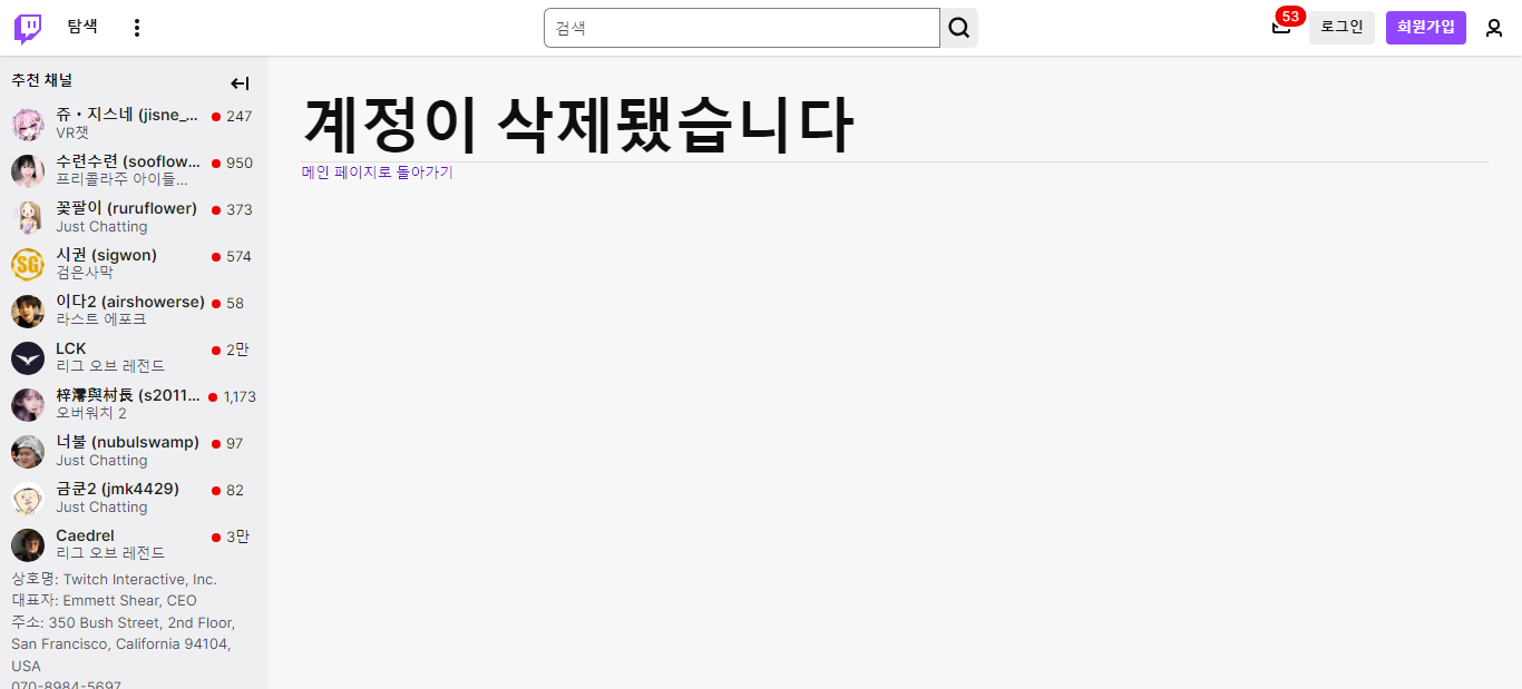 그러면 바로 계정이 삭제됐습니다 안내와 함께 트위치 에서 계정이 탈퇴 삭제 처리가 됩니다. (임시 탈퇴상태 입니다.)